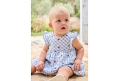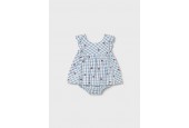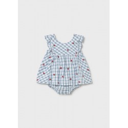 VESTIDO y CUBREPAÑAL a juego en tela de cuadritos azul con bordado de fresas.