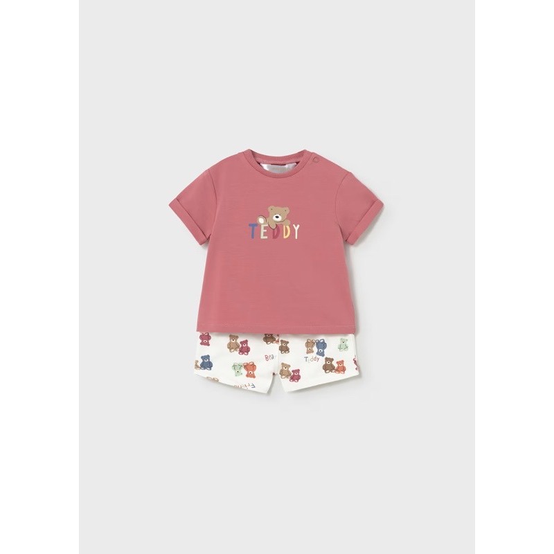 cAMISETA en tono terracota y PANTALÓN corto estampado.