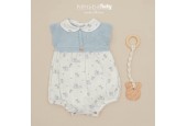 PELELE con cuerpo de punto en color azul empolvado y cuello bebé combinado con tela estampada para recién nacido.