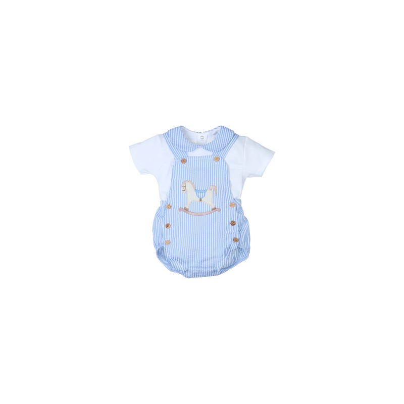 CAMISETA de manga corta con cuello bebé y RANITA PETO en tela rayas celeste.